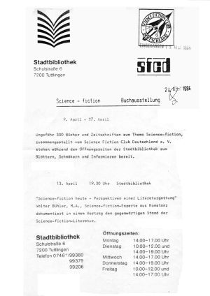 Eine Science-fiction Buchausstellung fand vom 9. bis 27. April 1984 in der Stadtbibliothek