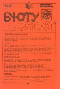 Doch dann kam die Mitgliederversammlung des SFCD am 10. August 1975 in Laichingen. Dort gab es eine Kontroverse über die Aufnahme des Magazins Science Fiction Times in die Clubleistungen. Das wurde mehrheitlich abgelehnt. Daraufhin legten Vertreter des linken Vereinsflügels Funktionen nieder und zogen Kandidaturen für die Vorstandswahl zurück. Uwe Anton trat als Andromeda Nachrichten-Redakteur für die Sparten Fandom- und Literatur zurück. Auf der Tagesordnung stand auch Story Center. Es gab u. a. Differenzen wegen der Finanzierung des Magazins. Schließlich stellte Uwe Anton einen Antrag auf Einstellung von Story Center, der mit 51 Ja- und acht Gegenstimmen bei elf Enthaltungen angenommen wurde.[2] In den nächsten vier Jahren erschien nun kein Story Center mehr.