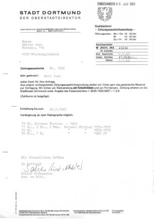 Die Zeitungsausschnittsammlung der Bibliotheken der Stadt Dortmund ist eine Sammlung von Zeitungsberichten, Broschüren u. a. zu verschiedensten Themengebieten. Ausschnittmappen zu einzelnen Themen konnten gegen Portoersatz ausgeliehen werden. 1983 gab es eine Sammlung zum Thema Science Fiction, die u. a. 296 Blatt Berichte aus den Jahren 1923 bis 1980 umfasste. Der Gesamtbestand aller Themen aus den Jahren 1909 bis 1984 umfasst 110 Einheiten in 20 Kartons, inzwischen gelagert beim Landesarchiv Nordrhein-Westfalen Abteilung Rheinland[1].